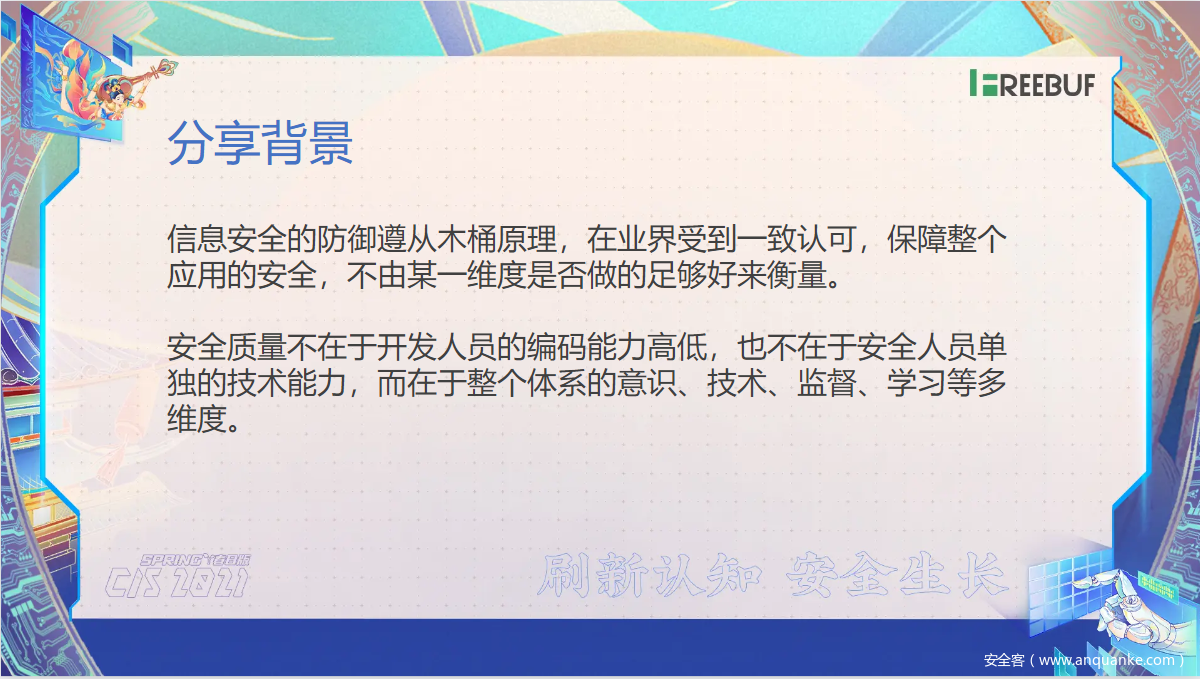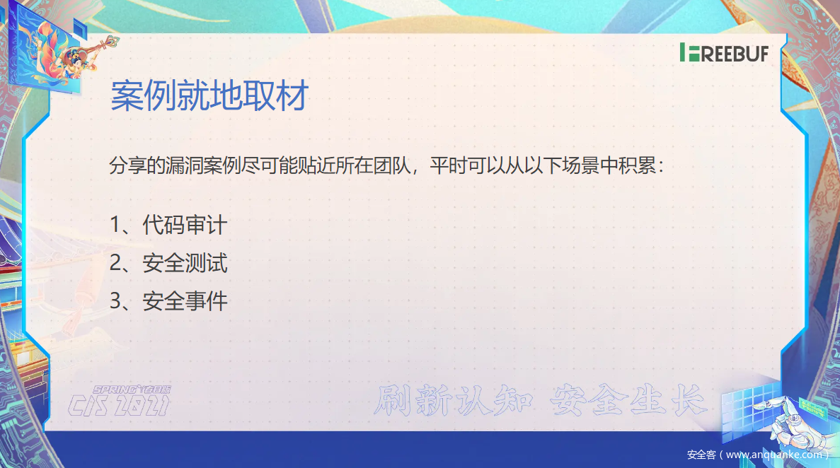说了你要有这个时间的一个意识,你不要一直讲,讲完之后翻其他人压根就没来听,你要有以这样一个互动机制。那这里有三点了,我需要给大家去说的。就第一个了就是开始讲到了,你一定要贴近这个团队的一个真实代码。你每次给他做培训的时候了,你得先把她代码审计一遍,审计完了多多少少可能会有一些安全问题,或者说有些不规范的问题。你拿着这个代码去跟他说,你不要直接上来,对案例那样不是不好的,很多人可能就不乐意听。那么第二个就是要贴近他的业务场景,刚才也讲到了,那做 TCP 的你给他讲 HTTP 他不乐意听他,我压根就没有这个业务,你给我讲啥呢?第三个就是多分享故事的一个形式去形成一个互动的气氛。比如说你在给他做培训的时候,你给他讲越全的时候,那你就讲以前了,可能你挖过某个网站的一个预存漏洞,你是怎么发现的,以及你可能在网上了看到过别人的一些案例,那这些分析步骤了你可以给他讲一下。