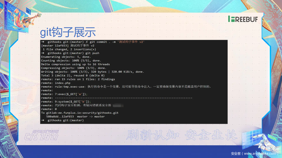 那这里我给大家展示一下这个钩子了,它会是一样一个什么样效果?比如说我在命令行当中,我输入了一个 git commit 然后提交这个代码,然后在推送的时候它就会触发。那么在推送的时候,我们可以看到他这边告诉我哪个文件。那么它的行号,当中有个 EXEC 执行了这个 git 当中的 A 这个变量,那么它有可能会导致一个命令注入,那一定要确保内容不是用户随意控制的。那么这样一个提示性的话语,那具体了你可以去把这个界面了给它优化一下也可以。