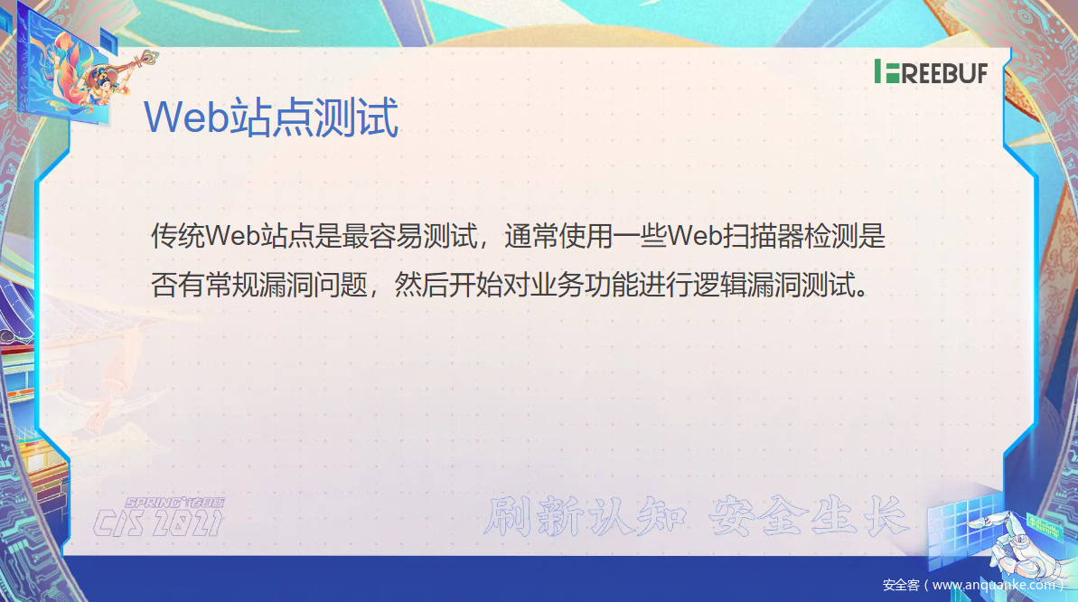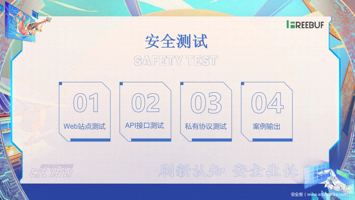 再就给大家分享一个安全测试当中,安全测试主要有这几个, web 站点测试、API接口测试、私有协议测试和案例输出。