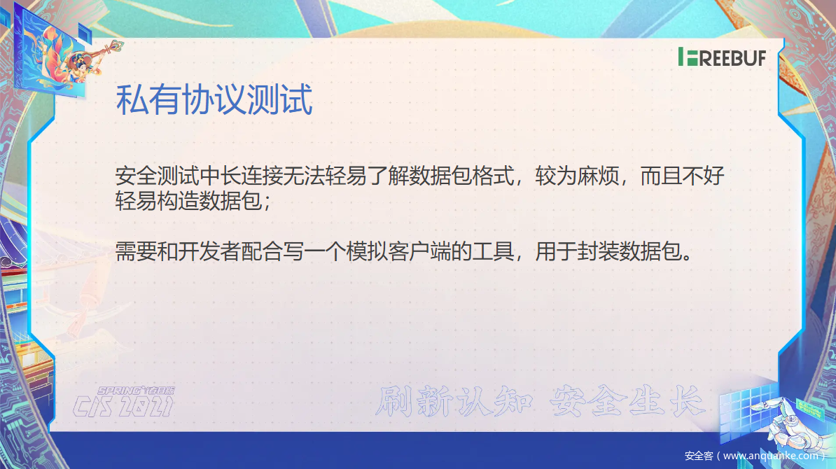 第三个就是私有协议测试,那私有协议了其实测试起来是比较麻烦的,比如说这个socket的协议,那么 TCP 协议,那么我们其实是没有办法直接把这个数据包了给解析出来的,除非了我们得有一个模拟他们的客户端。那目前来说只有几个就是重点项目了,我们会和他们对一下这个端和服务端的数据的一个格式,然后进行模拟测试。那这个工作量还是蛮大的。所以这个私有协议了,看各位的这个人手够不够了,没有太多好方法,只能去模拟这样一个这个私有协议的客户端。