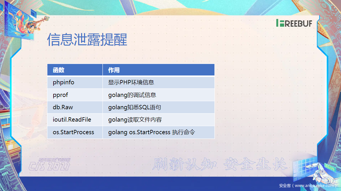 你都可以放到你的这个安全风险提醒里面去。我觉得优先级了,你可以把这些高危的了给大家放进去。比如像 FTP 的,你可以看情况,你放不放都行。那像 pprof 了,我觉得你肯定得注意。那 PP info 里面还是有蛮重要的信息的以及 Golang 里面的,它直接使用了裸写了这个语句以及读取文件内容以及执行系统命令的这些危险函数了,你都给它去提醒一下。