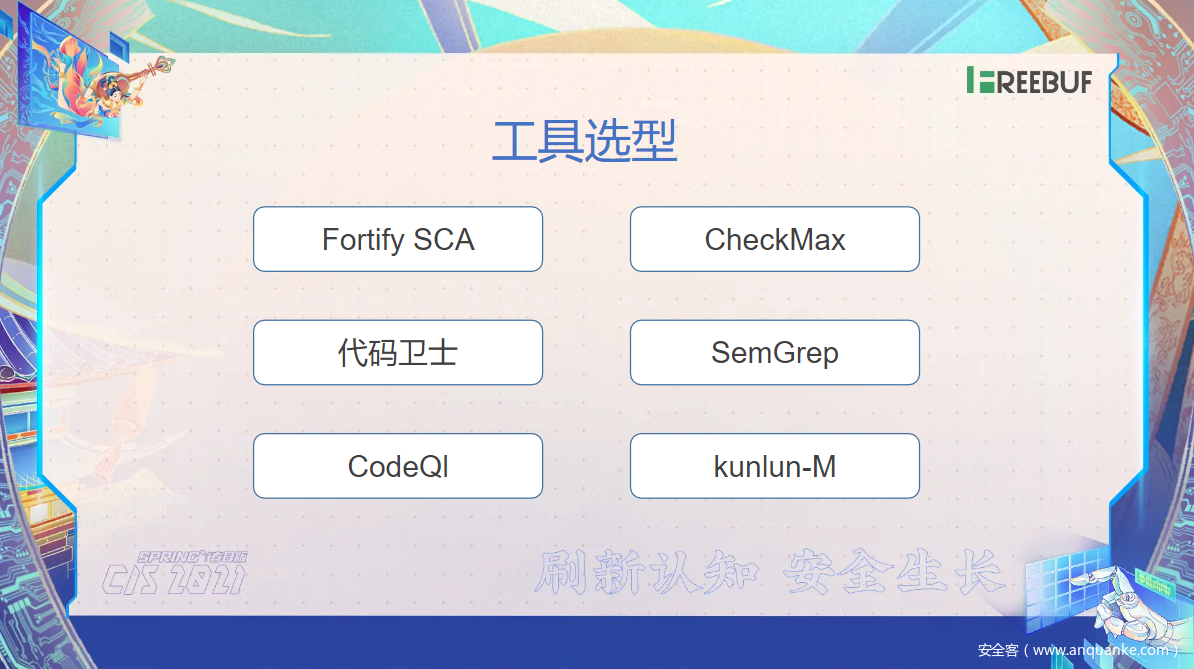 那么这个时候呢您得借助一些第三方的一些工具去分析出来。说到这个代码审计的一些工具选型了,目前前这些我大部分都用过,比如说 fortify ,用的是比较熟练的。那么 check max 了这一款工具了,我还没用,因为还没有买他们的第三款这个代码卫士的话是那个奇安信的。那这一款我倒是用过一段时间。