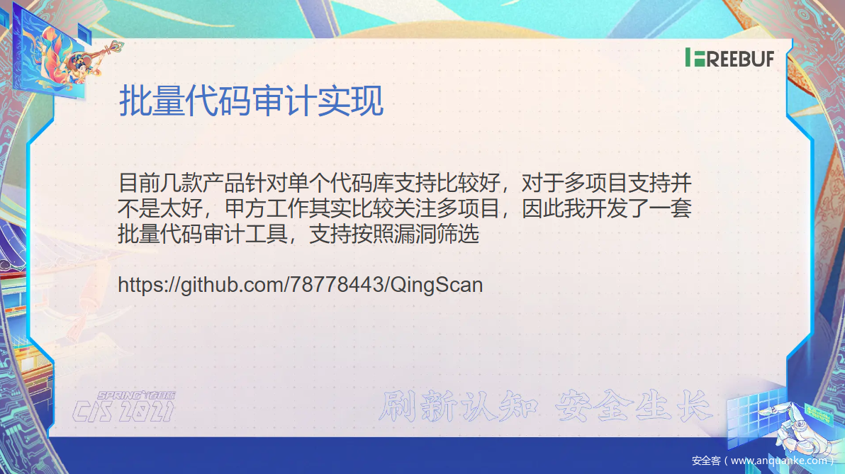 所以我写了一个批量代码审计的一个工具,就是QingScan。那么它主要的作用它其实是包含了四部分,一部分就是信息收集,第二部就黑盒检测,第三部分就是代码审计。那还有一个专项利用。那这里我主要提一下它这个白盒审计。那白货审计它其实主要的目的就是把你的这个项目了给拉下来,然后调用这个 fortify 以及这个sem group还有其他的一些代码审计的一些工具了,对它进行逐个扫描。那么扫描完这个,然后接着就扫描下一个。那么也可以分布式部署。那目前来说我已经在我们公司使用起来了,也推荐给大家去试用一下,那么这个地址在这里