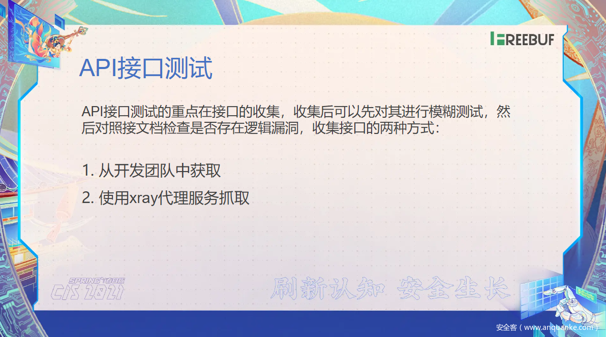 那传统的外部站点测出来是最简单的,无非就是先收集地址,然后测试一下常规有没有问题点,然后对这个业务功能进行测试一下。那业务功能也就是说我越权支付,然后用户密码找回验证码等等。好 API 接口了。那主要就是我们要把地址先拿到,拿到地址之后其实其他的测试方法都差不多。那么拿了这个地址了,我们有两种方式。第一种说从开发团队那边直接拿到一份 API 该的一个列表,然后并且搞得清楚他们每一个参数是做什么用的。然后对这些接口了去进行一些扫描测试以及一些逻辑性测试,和传统概念区别不大了。