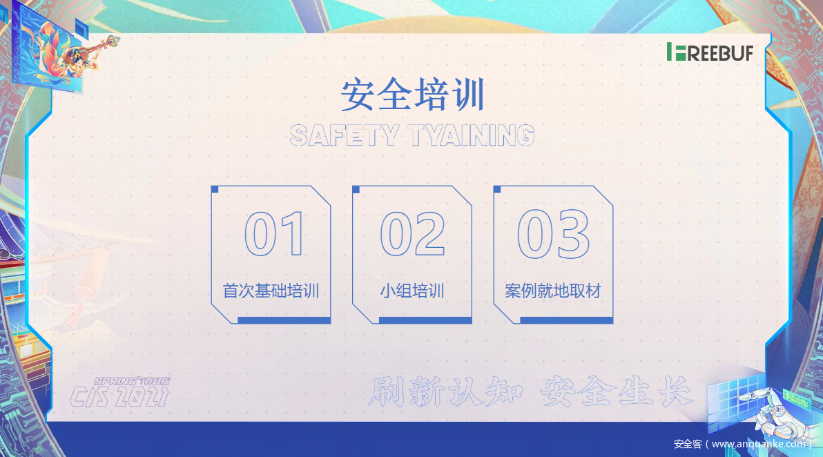 第四点是是通过事件驱动,我相信作为甲方,你肯定还会遇到一些安全事件去驱动。比如说我们公司是做游戏的,还时不时会有一些拖机挂或者等等一些外挂这些方面的问题。那么我们会把这些事情给整理起来,整理成案例,再给这些开发人员去学习。