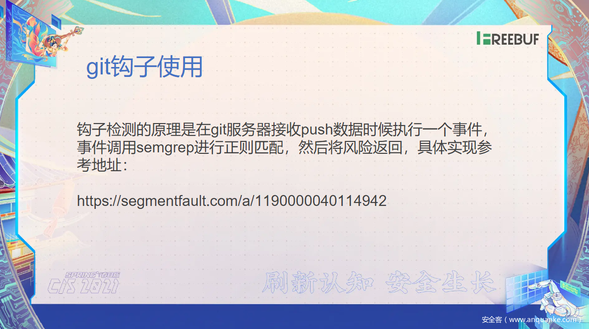 第三个就是我们告诉你了,你不能怎么去写,你应该怎么去写。那么我们制定完这一套规则了,我们不可能说其实人工去盯着您得有一套监督机制。这里我也会给大家去讲一下,怎么去结合semgrep 和GitLab做一个钩子事件,实时检测这个代码当中的一些风险点。