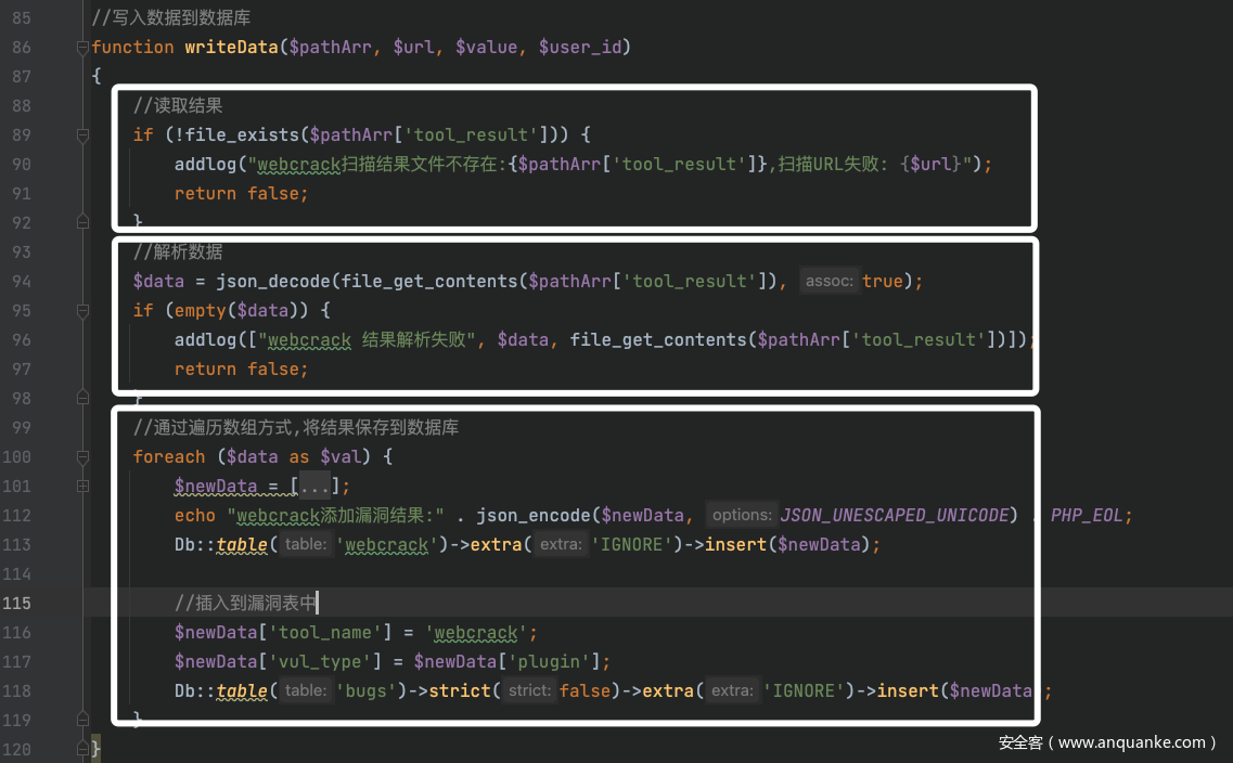 在这个方法里可以看到只做了三件事,首先读取工具的结果,然后将结果的JSON字符串转换为数组,之后插入数据库即可。