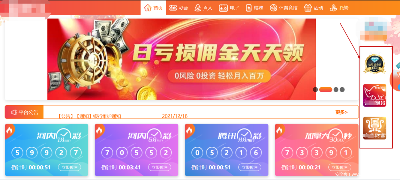 通过其隐藏的注册入口,注册成功进入页面后,观察到该平台相较于常见的博彩平台,页面除了彩票、真人、棋牌、电竞等博彩板块外,还多了奖源认证和托管跑分。