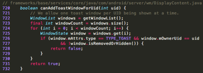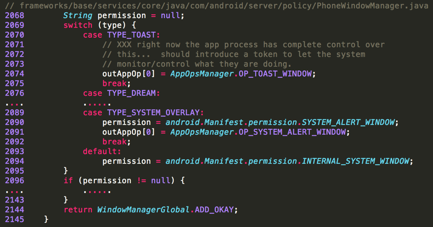 此漏洞是由于缺少权限检查造成的。在Android的AOSP相关代码段(版本<= 7)中可以看到,是如图2所示。通常,将窗口覆盖在其他应用程序的顶部需要进行权限检查和操作检查。然而,在TYPE_TOAST案例中,那些检查并不到位。请求将自动被授予。根据图2中的注释,该应用程序将被授予对TYPE_TOAST窗口的完全控制权。