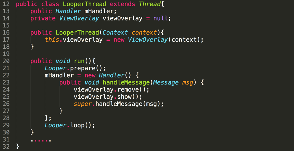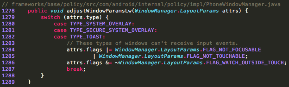 对于Android 7.1版本,想要达到同样的overlay攻击,恶意软件需要利用LooperThread去不停地展示Toast窗口(图5)。但是在同一时间,只有一个overlay可以使用,所以,恶意程序无法监控用户是否淡季了覆盖区域中的预期区域。另一种方法是展示一个overlay,诱导用户去单击它,休眠几秒钟,然后切换到另外的一个overlay进行其他的步骤。显然,通过这种缓解措施,overlay攻击的成功几率微乎甚微。这种方法同样适用于Android2.3.7~4.3。因为在上述版本中,Toast窗口中移除了FLAG“FLAG_WATCH_OUTSIDE_TOUCH”(图6)。