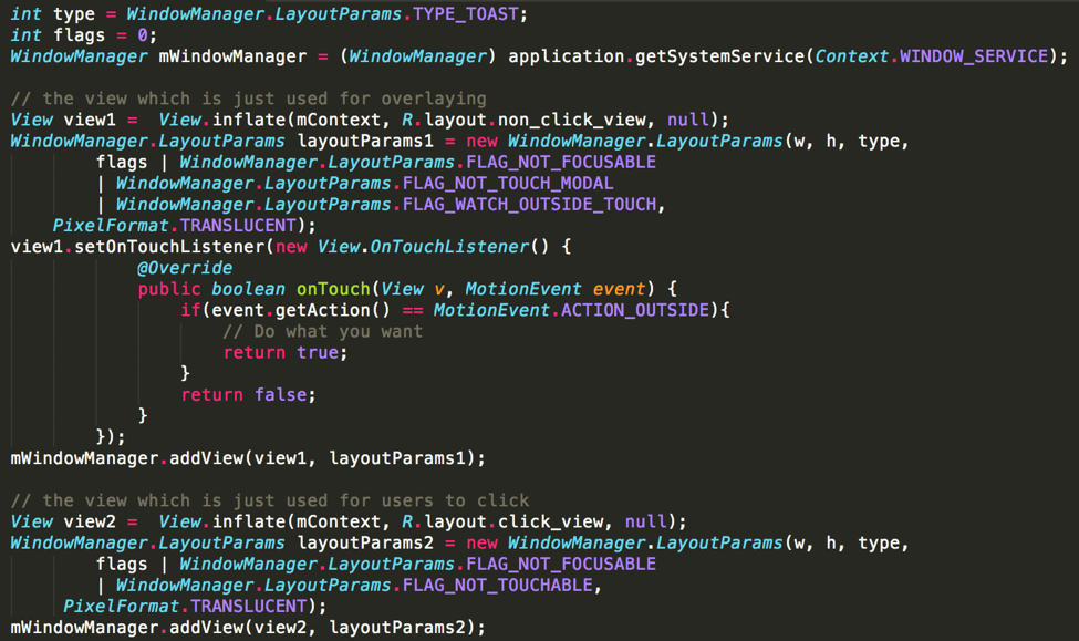 使用TYPE_TOAST窗口的攻击也实现了这一点,将视图flag设置为FLAG_NOT_FOCUSABLE和FLAG_NOT_TOUCHABLE,我们可以在没有任何特殊权限的情况下发起类似的攻击。