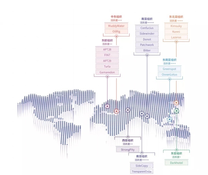 2021年,NDR团队将注意力集中在我国周边APT组织上,对来自于东亚、东南亚、东北亚、南亚、西亚、东欧、中东的APT组织进行长期深入的持续性跟踪,并主要对下图所示的21个活跃APT组织的攻击活动进行监控和追踪分析。