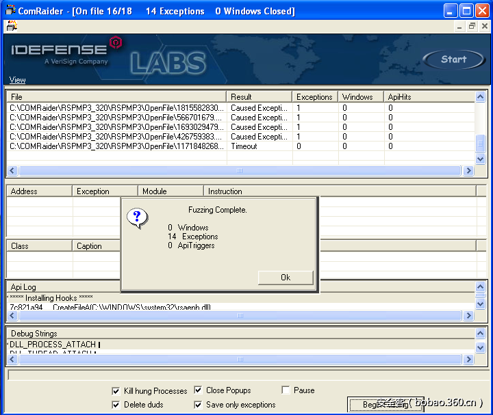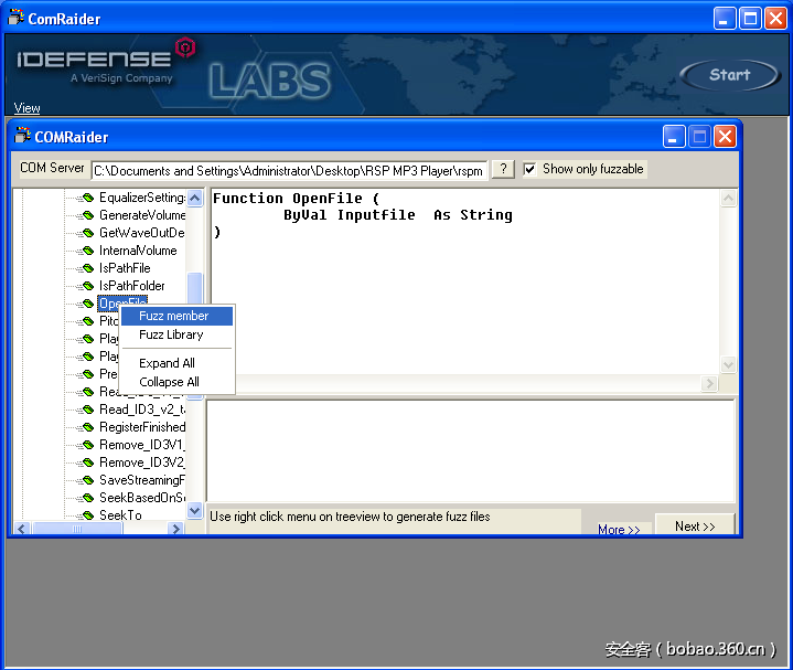 注册ocx控件,你能看到一个弹框说文件已经成功注册。接着下载 COMRaider。COMRaider是一个很好用的ActiveX Fuzzer工具。用这个工具可以轻易得到POC。看看原始的exploit可以知道崩溃出现在OpenFile函数。如果我们只Fuzzing这个函数会得到14个异常例子。我没有花时间测试所有的文件,但我怀疑如果你测试完所有的文件会发现大量的可利用的崩溃!
