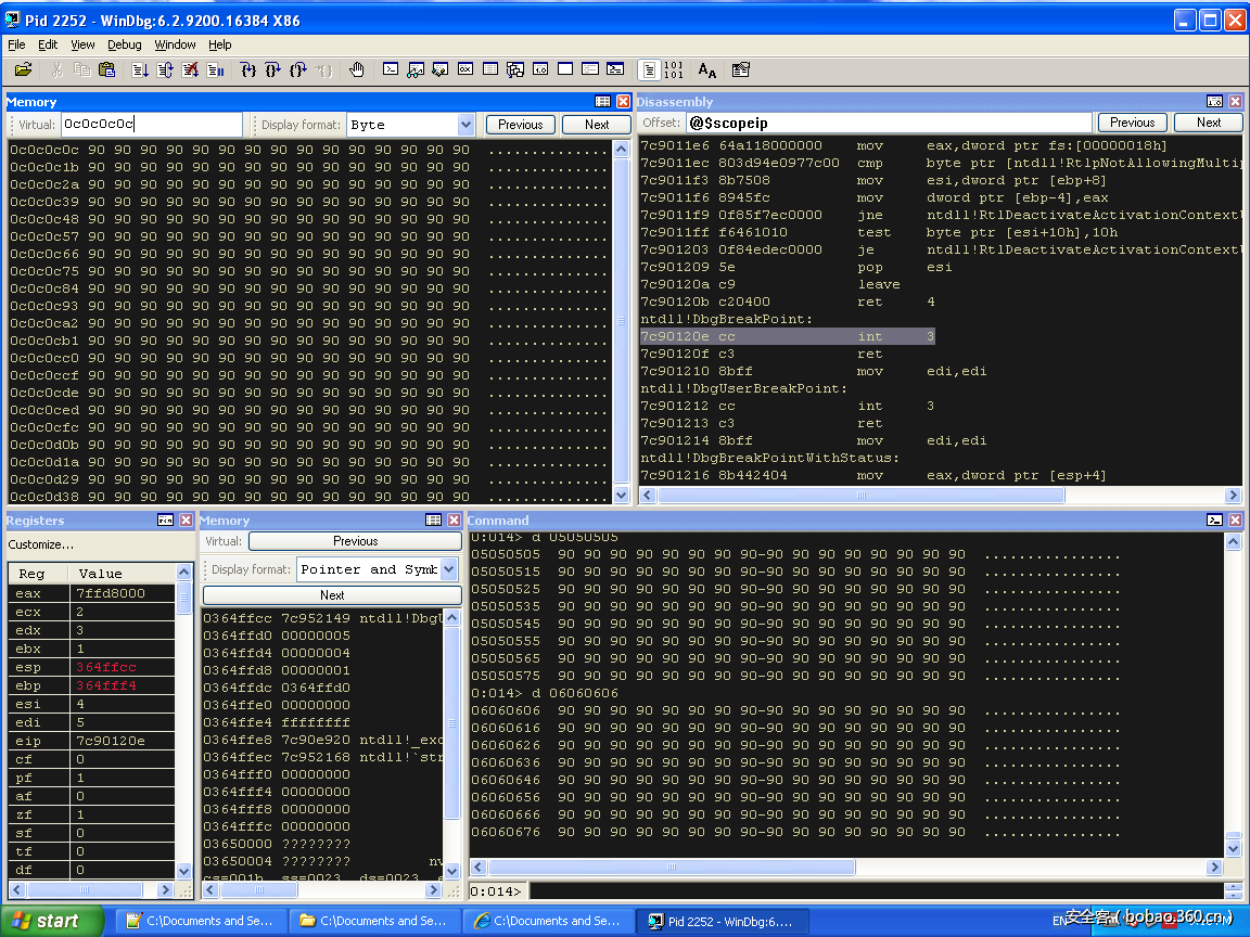 eax=00000000 ebx=00000000 ecx=06060606 edx=7c9032bc esi=00000000 edi=00000000