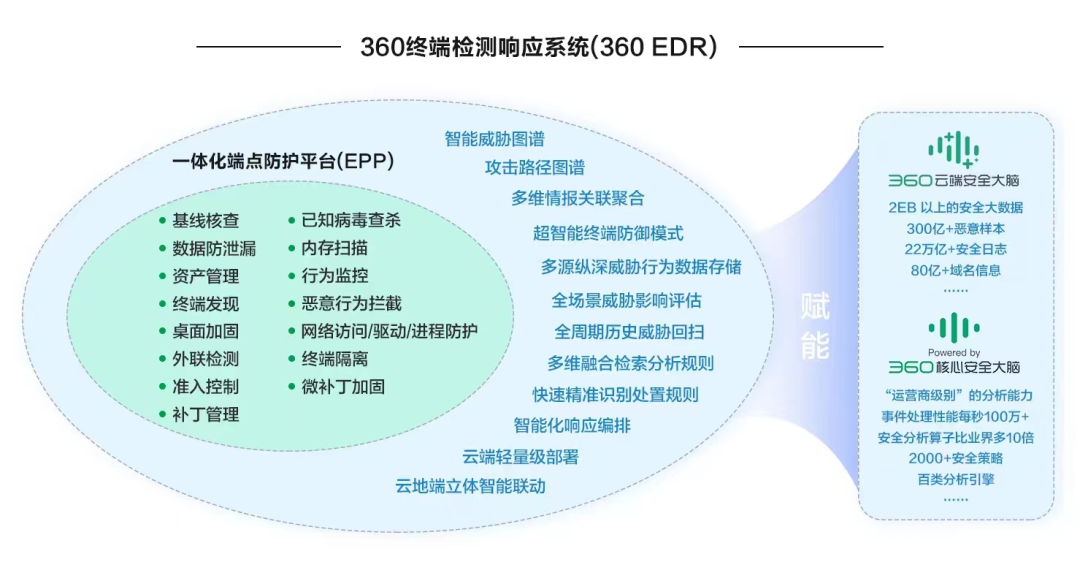 作为面向未来的EDR解决方案,360EDR是基于360云端安全大脑EB级数据情报赋能、360核心安全大脑“运营商”级分析算力、超内核级的精准威胁捕获技术、以及360安全团队17年威胁狩猎的实战攻防对抗知识打磨而成。360 EDR能帮助政企用户消除视觉盲点、认清风险的同时,自动化处置藏匿其中的恶意行为,深度追踪溯源取证攻击源头。同时,还支持轻量化部署,打造出一套超智能终端防御模式。具体而言: