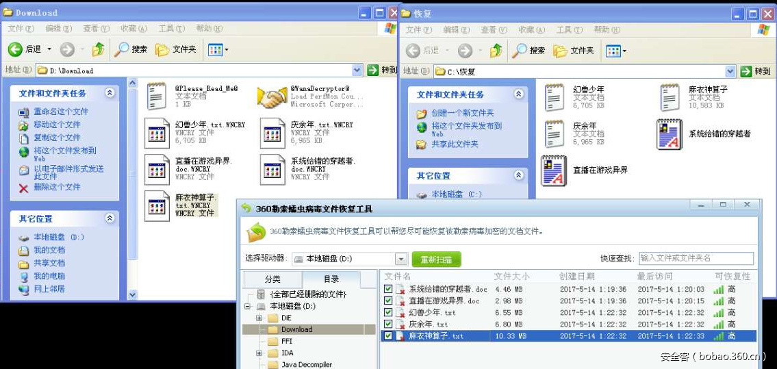 WNCRY病毒疯狂攻击全球上百个国家,无数宝贵资料被病毒加密,甚至有大学生毕业论文被锁死。360深入分析病毒原理,发现有可能恢复一定比例文件的急救方案,成功概率会受到文件数量等多重因素影响,详细教程见本文。越早操作,成功率越高!!