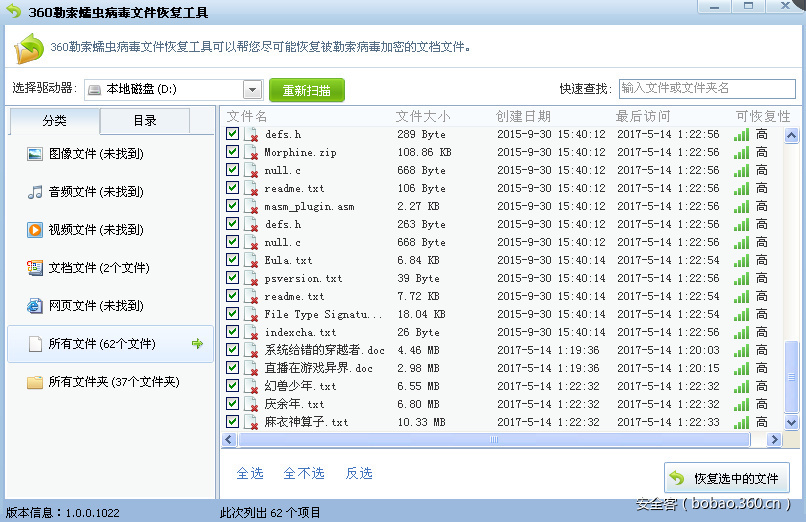 3.下载使用“360勒索蠕虫病毒文件恢复工具”恢复被加密的文件