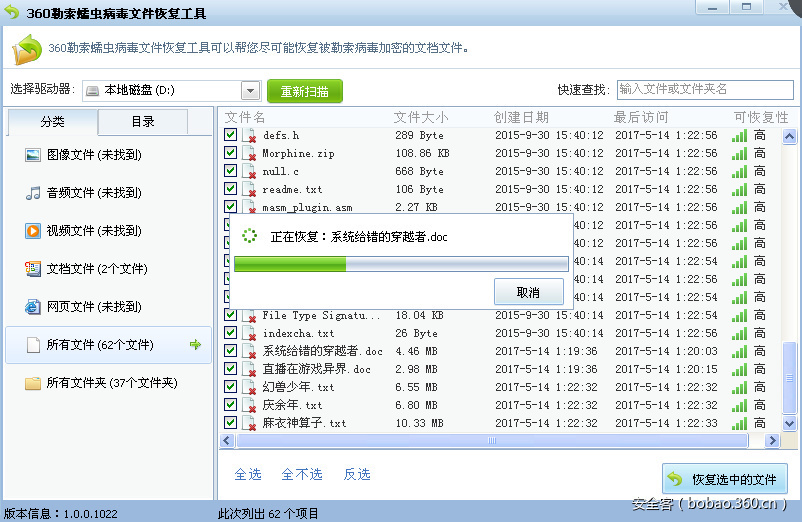 本工具的文件恢复成功率会受到文件数量、时间、磁盘操作情况等因素影响。一般来说,中毒后越早恢复,成功的几率越高。