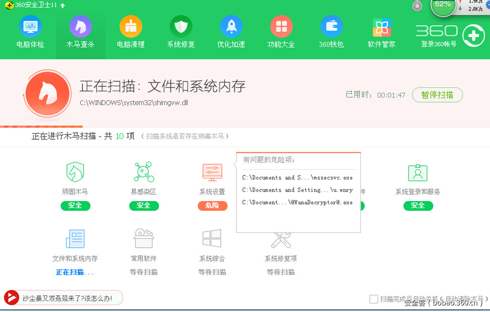 2.使用360木马查杀功能,清除全部木马,防止反复感染。