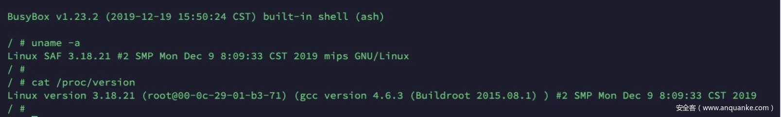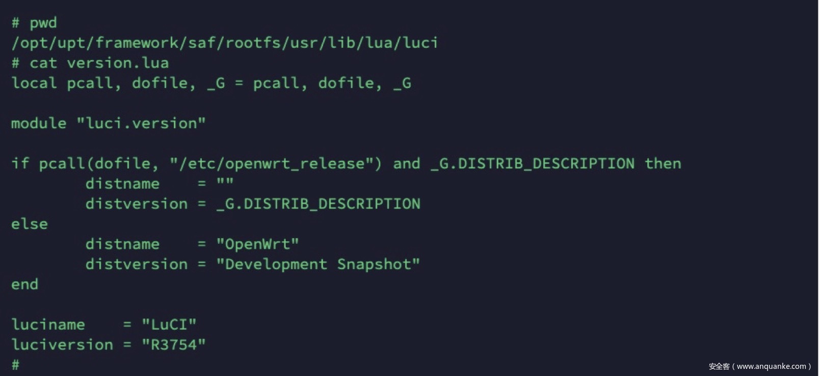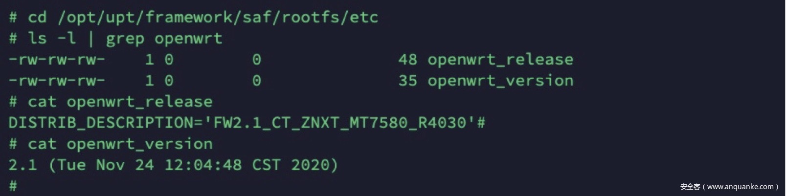 由于整个OpenWrt被电信工程师(也可能是兆能的工程师)改得有点狠,很多细节的地方也都被抹掉了,因此要判定ZN600到底跑的哪个版本OpenWrt还是不太容易。下面的截图是从OpenWrt容器中/etc目录下查看到的OpenWrt版本信息,可以看出工程师们可以抹去了版本信息,这对于Hacker而言着实让人极为很反感。不过,我们还是可以从中看出这个OpenWrt的一些信息,比如内部规定的发行版本信息以及更为关键的编译日期:2020年11月24日12点04分48秒,估计是在星期二午饭之前编译的~_^