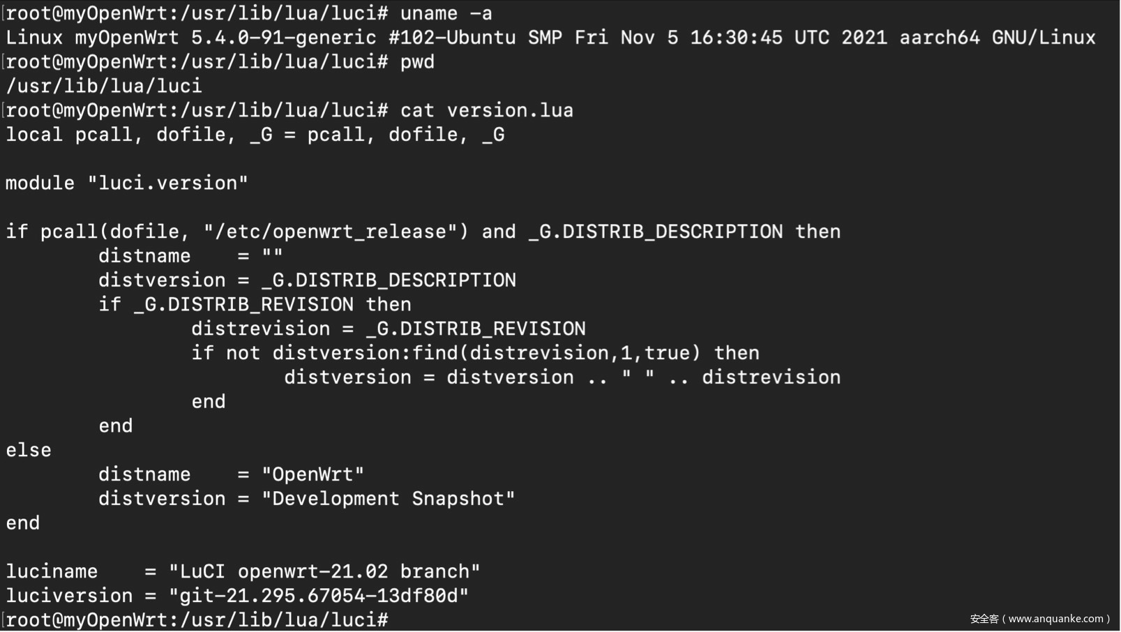 在OpenWrt官网找遍了,没找到任何R3754的LuCi版本。但仅仅因为这个就判断LuCi的版本信息是被篡改了,还有显得有些不够严谨。因此,我们在Ubunt里头安装Lxc并运行了OpenWrt 21版本,查看了原汁原味的LuCi版本信息是啥样的。最后,严谨的验证了我们认定电信工程师篡改了LuCi版本信息。