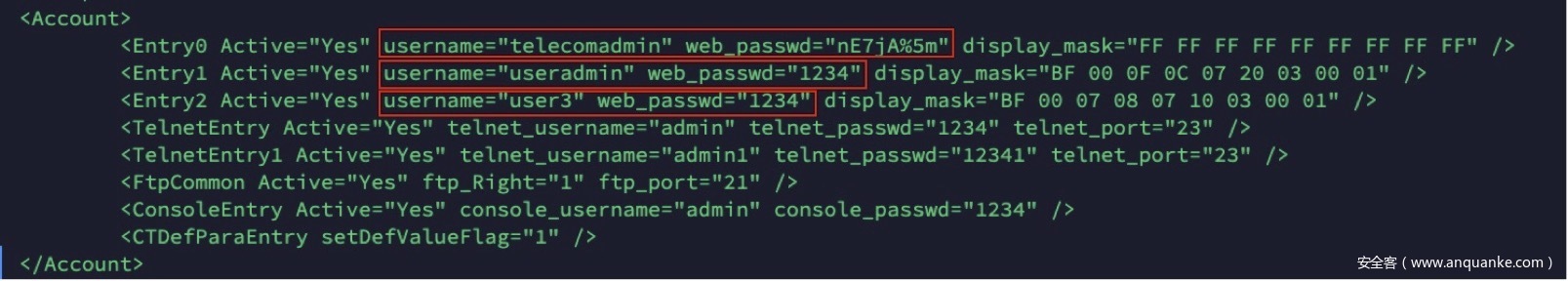 从我们的分析来看,这个配置文件应该是光猫厂商自己的配置文件,没有针对特定的运营商,甚至没有针对特定的地域范围。除此之外,在/userfs目录下还有一个名为romfile_f.cfg的xml格式配置文件,没有去进一步验证这两文件是不是内容一致。