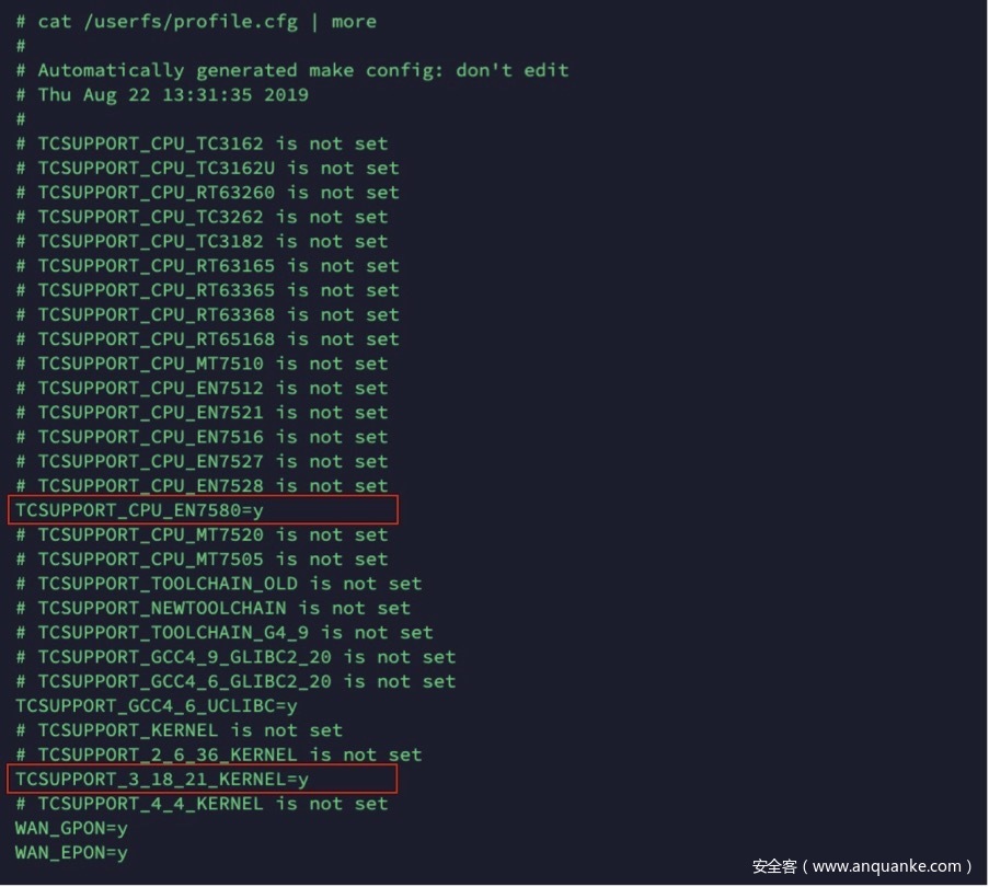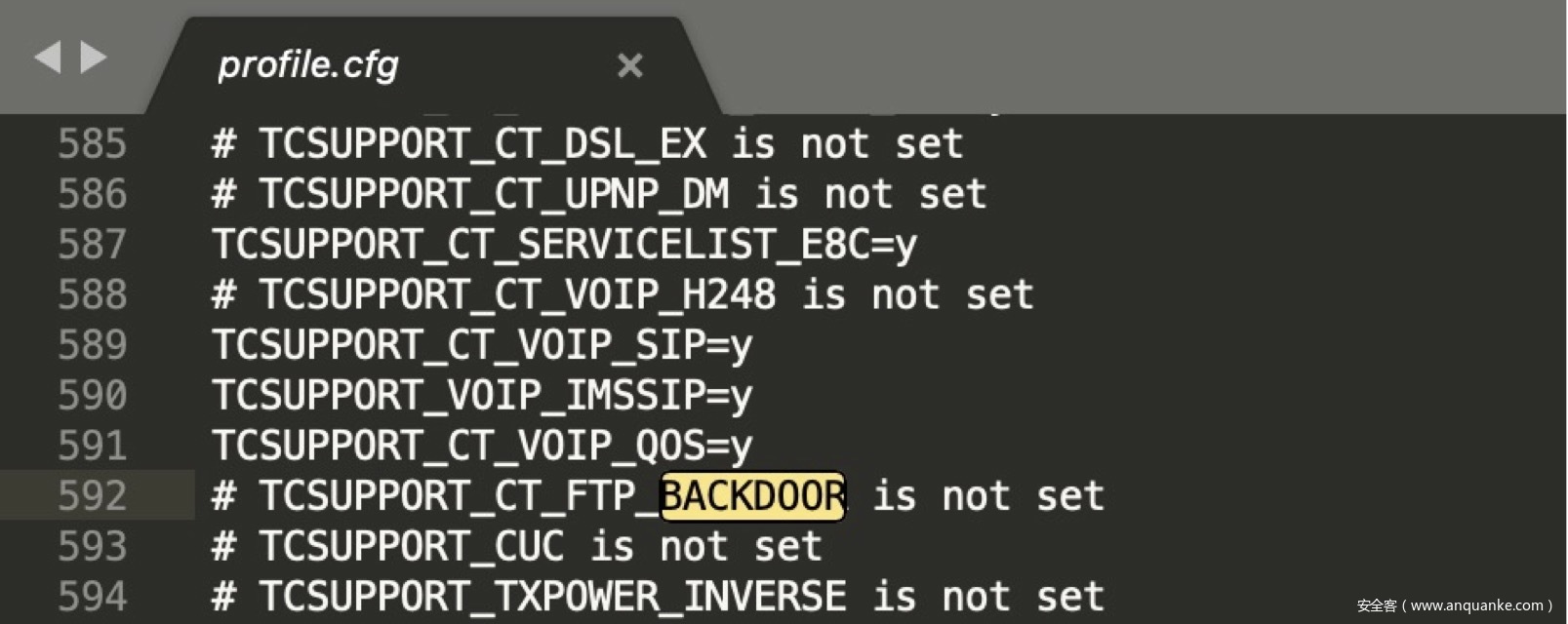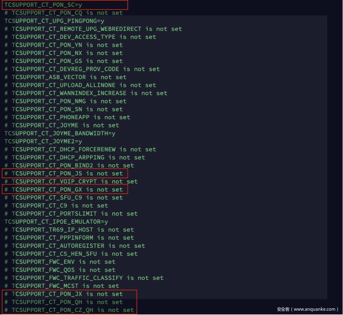 从前面对/etc/init.d/rcS启动脚本的分析,我们可以清楚地看到,ZN600开机之后的第一件事情就是读取配置文件/userfs/profile.cfg。这个配置文件中定义了各个不同厂商的光猫硬件信息和相关的软件配置信息。这个配置文件的设计思路很简单,如果某个参数或者选项被设定了则将其对应名称的字符串值赋值为y;否则,直接用#注销掉这个参数或选项。