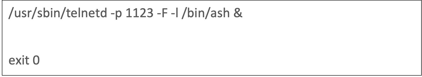 我们team能够切入到容器里头的OpenWrt还得感谢chinadsl.net论坛的大神achaoge在文章【6】中提供的技术思路——利用Linux系统的rc.local文件实现开机自启动,然后在别的端口运行telnet服务程序。这个方法有两个好处:一是,避开电信工程师苦心编写的saf容器管理程序,不跟这货正面刚,打不赢,咱玩儿迂回包抄;二是,这个方法还解决了telnet服务自启动(持久化)。