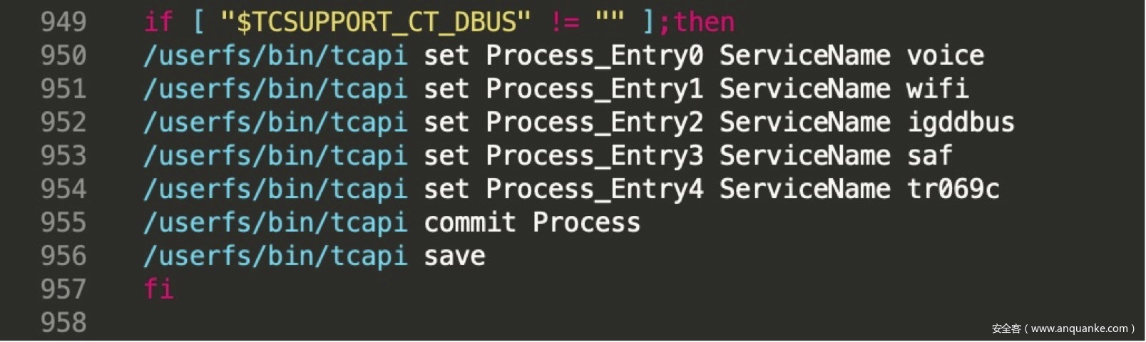 在rcS启动脚本最后的一段代码也验证了我们关于tcapi与DBus之间的关系。如果不支持DBus,那么就使用tcapi来对voice,wifi,igddbus,saf以及tr069c等五个进程对应的Process_Entry进行设置。