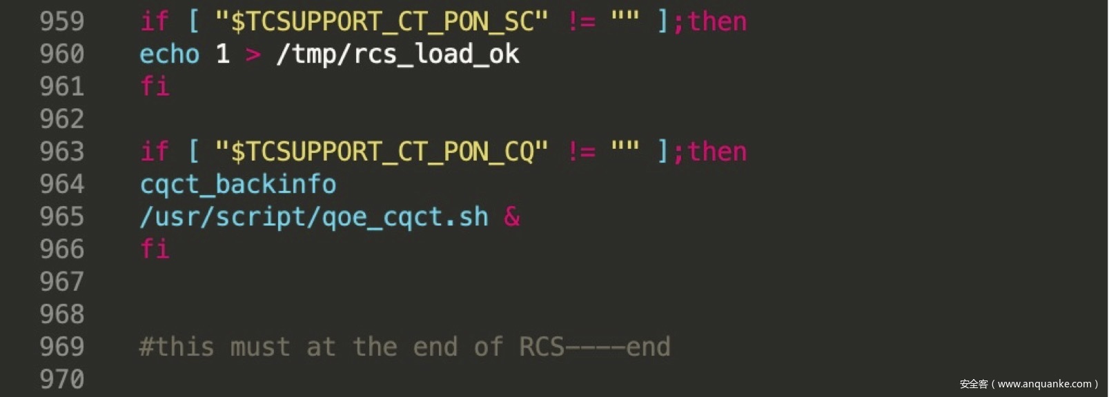 Step 6:诡异的结尾。按照电信的尿性,下面截图中的SC和CQ应该分别代表了四川和重庆,可是为什么要区别对待呢?一旦判断猫是四川的,就在/tmp/rcs_load_ok中写个1。如果猫是重庆的,就要执行cqct_backinfo程序,然后还要在后台跑/usr/script/qoe_cqct.sh的脚本。这啥情况啊???