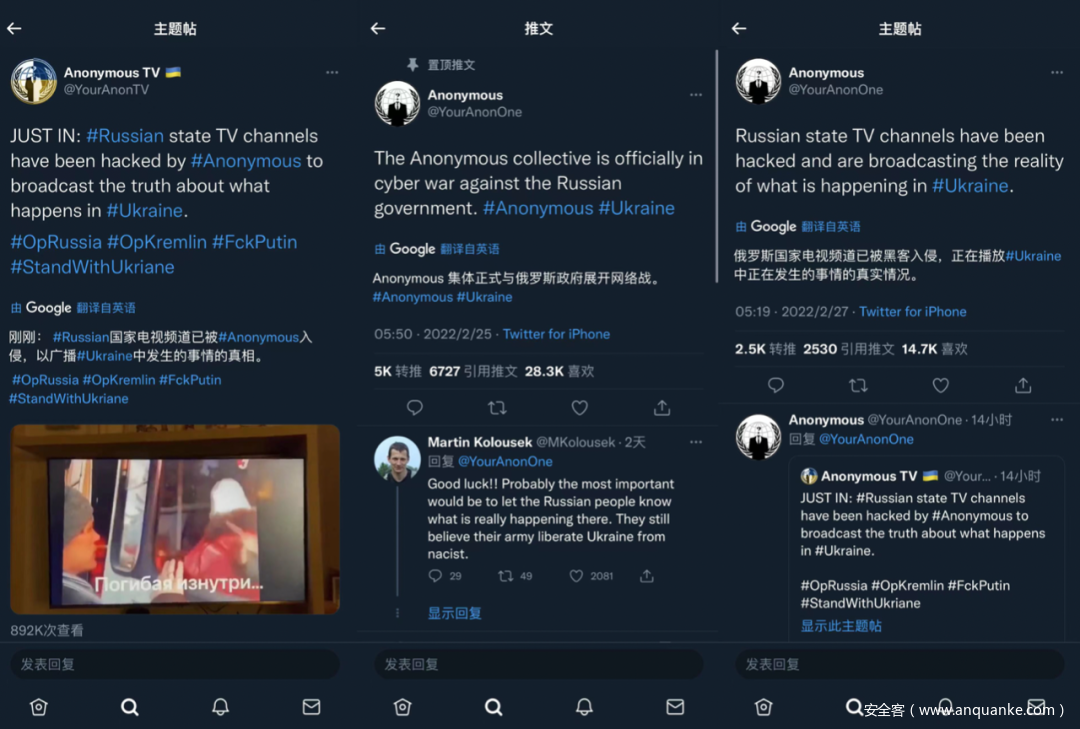 1、国际黑客组织公开“对俄宣战”