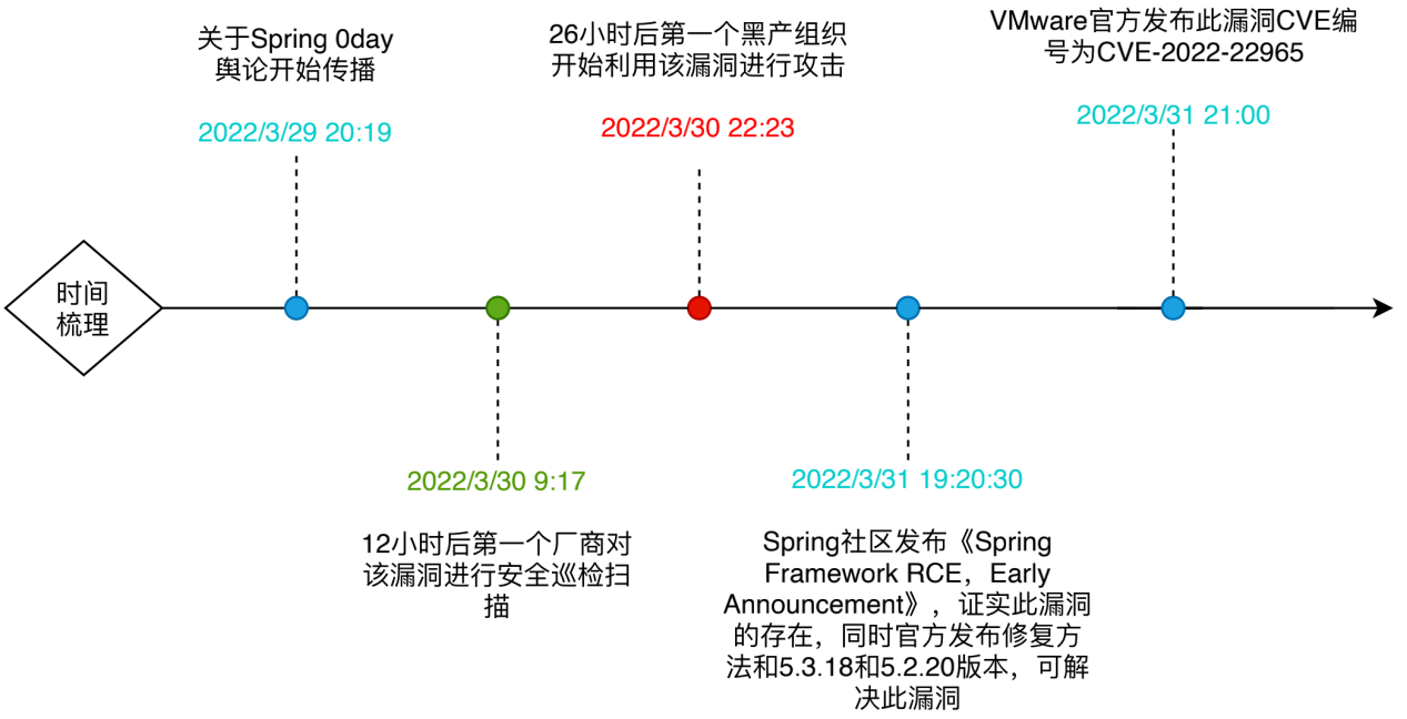 由于该漏洞为国内安全研究人员发现,并且漏洞舆论形成远远早于Spring官方的通告。所以将该漏洞的爆发时间点定为漏洞舆论大规模传播的时间点2022年3月29日20点,而非Spring官方发布公告的时间。