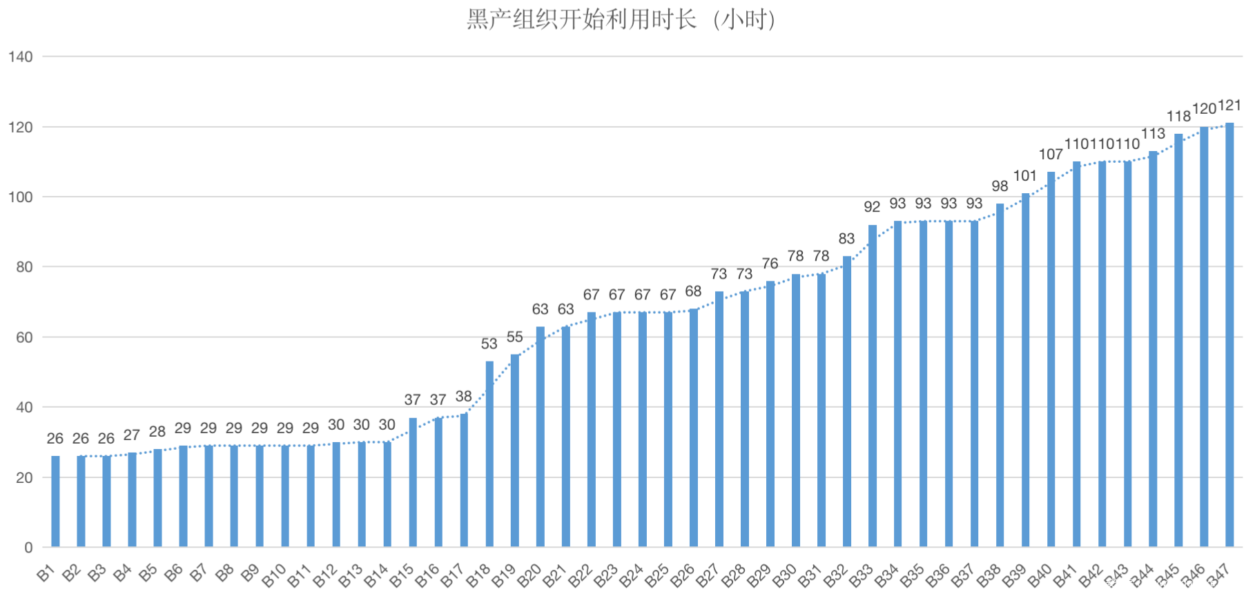 对捕获到的5天内的黑产团队的攻击行为,进行统计分析发现。黑产组织最快在漏洞爆发26小时后,发起了漏洞恶意利用行为。根据统计47个黑产IP平均在66个小时后进行了漏洞利用。大部分黑产组织在漏洞爆发后的100个小时内发起漏洞利用。