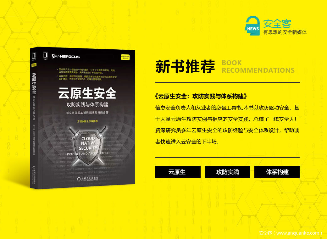 双十一全民剁手之际,安仔携新书推荐福利与众师傅相聚~这次,小安为诸位师傅带来的是绿盟科技星云实验室大佬心血凝结的《云原生安全:攻防实践与体系构建》。