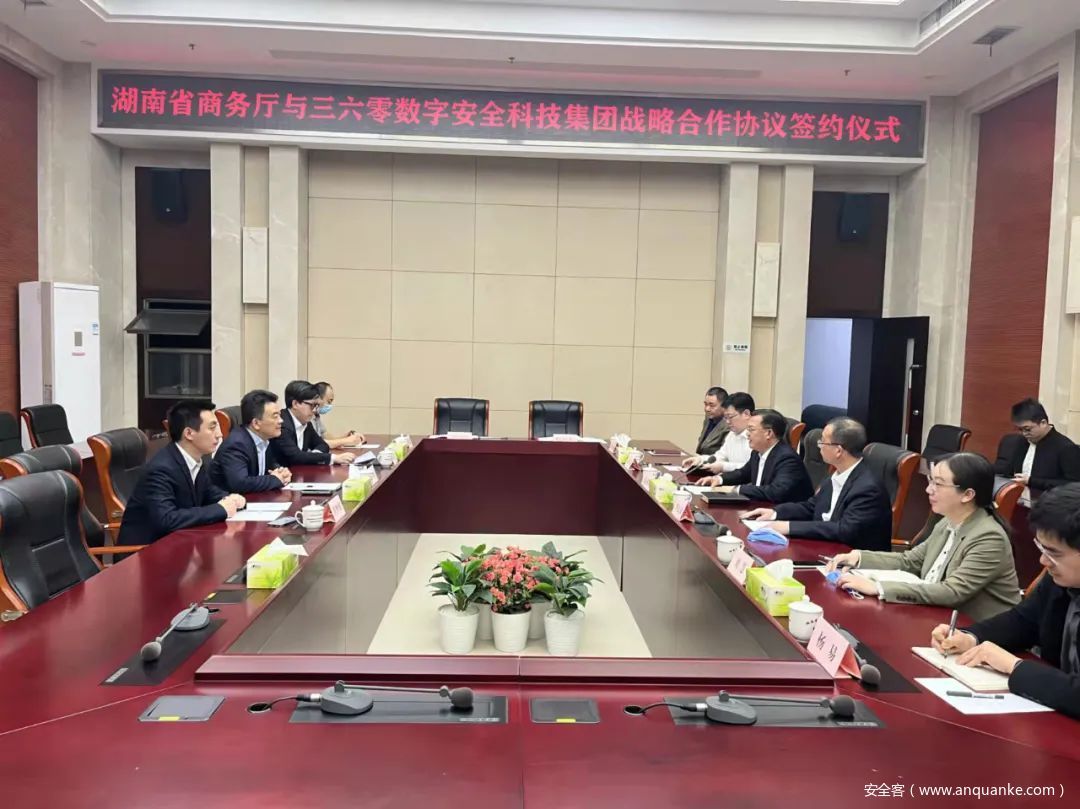 近日,湖南省商务厅厅长沈裕谋会见了360集团总裁张备一行,并共同见证湖南省商务厅与三六零数字安全科技集团(简称“360政企安全集团”)就促进中非经贸数字化发展签署战略合作协议。