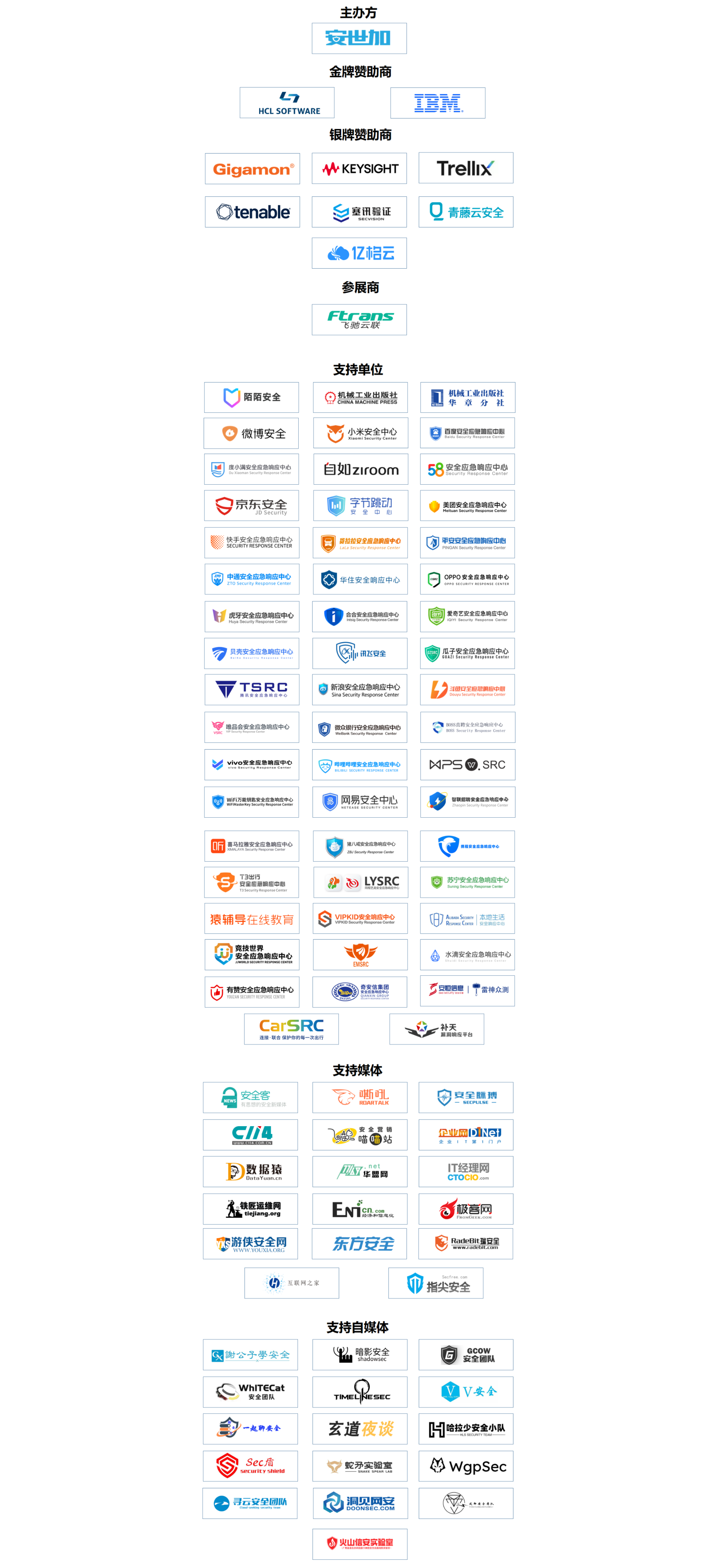 本次峰会共有HCL、IBM、技盟(Gigamon)、是德科技、Trellix、Tenable、塞讯验证、青藤云安全、亿格云、飞驰云联等多家企业赞助,并获得超过50家单位和33家媒体的鼎力支持报道。