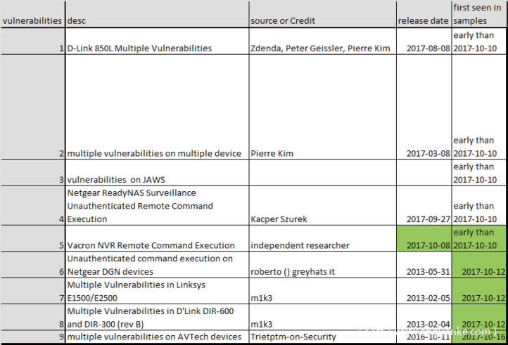其中最为可评说的是 IoT_reaper 完全放弃了 mirai 中利用弱口令猜测的方式,转为利用 IoT 设备的漏洞植入,当前样本中集成了了 9 个 IoT 设备漏洞。