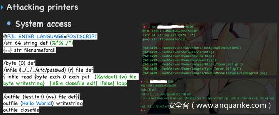在打印机寻求攻击面上 , 除了常规的 web 控制端 , 631 端口 ipp 访问弱口令一类认证问题 , 我们还发现了 9100 端口 PJL 服务安全问题。