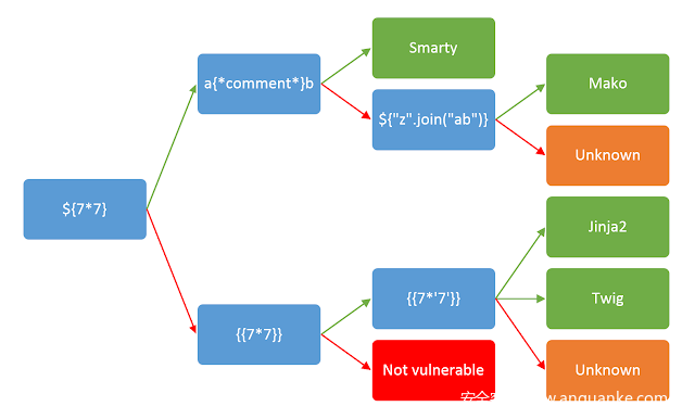 还是 HackTricks(https://book.hacktricks.xyz/pentesting-web/ssti-server-side-template-injection) 中的这张老图,这里利用的实际上是各种语法来进行判断,比如单括号内可以执行表达式, 以{**} 为注释符就可以判断我们的模板为 Smarty 模板,具体的语法还是要去看手册。