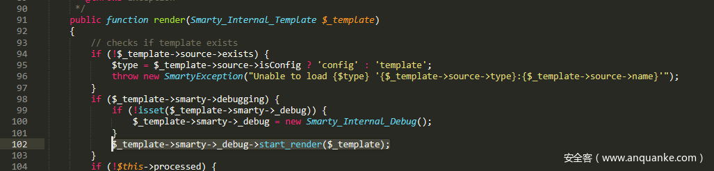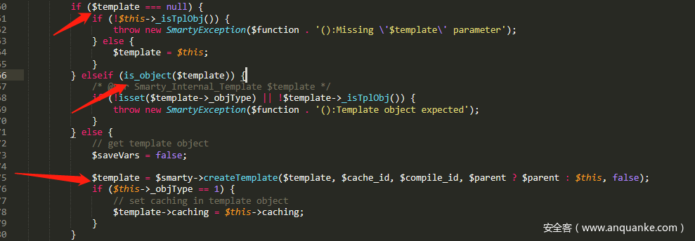 我们传入的显然进入了最后的 else,可以看到我们调用 createTemplate() 创建了模板,这里返回的 $template 是一个 SmartyInternalTemplate 对象