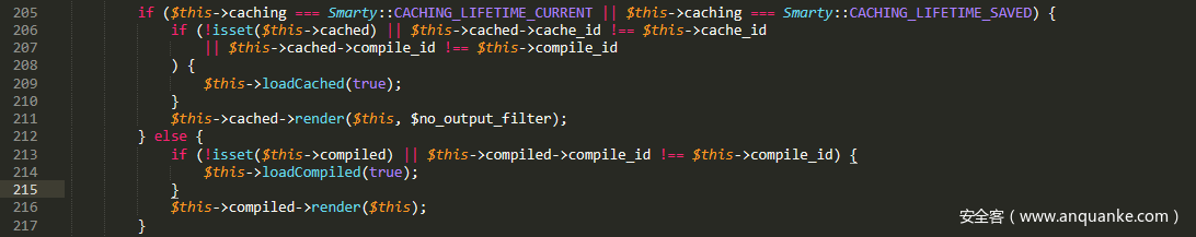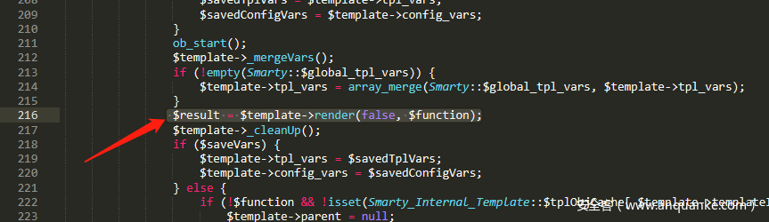 跟进到 SmartyInternalTemplate 类中,这里因为我们之前没有进行过模板缓存文件的生成会进入这里的 else,我们继续跟进 smartytemplatecompiled 类中的这个 render