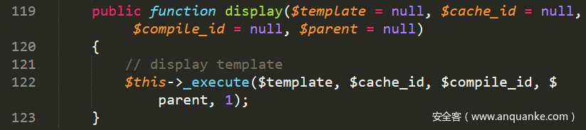 我们只传入了一个参数也就是说我们传入给 display 的参数就是这里的 $template,跟进 _execute()