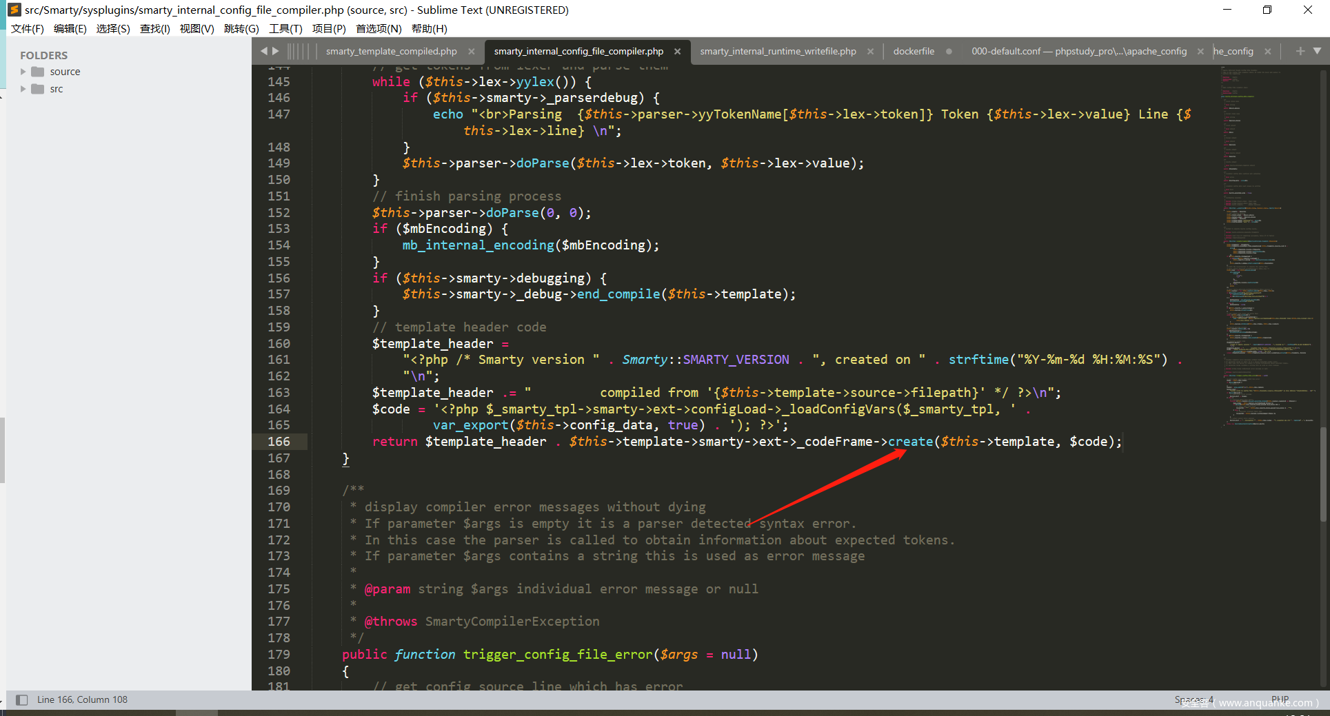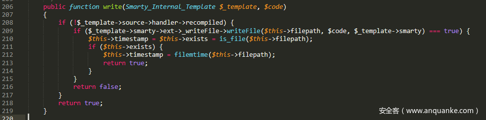 可以看到这里的 $this->write($_template,$_template->compiler->compileTemplate($_template)) 调用,就在下面