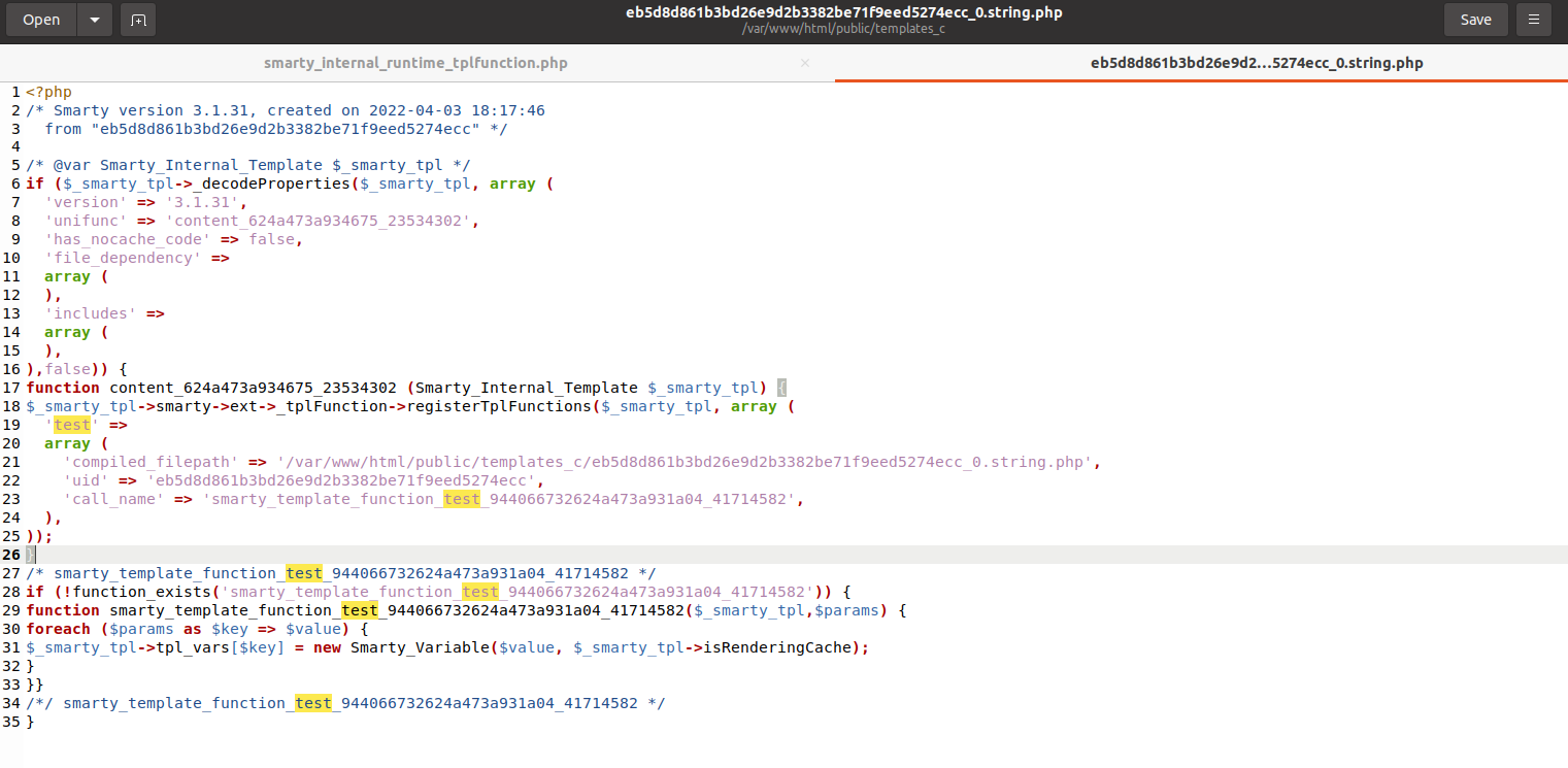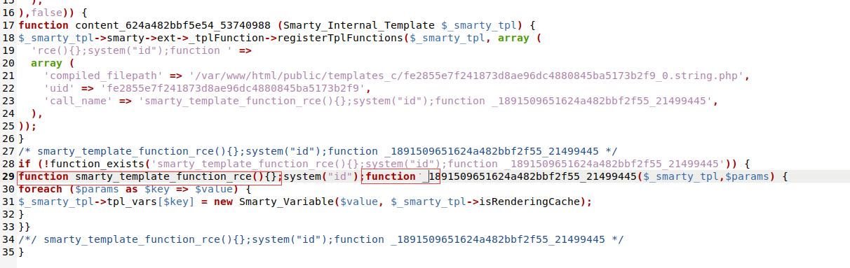 CVE-2021-26120 为 SmartyInternalRuntime_TplFunction 沙箱逃逸漏洞,所利用 POC 如下: