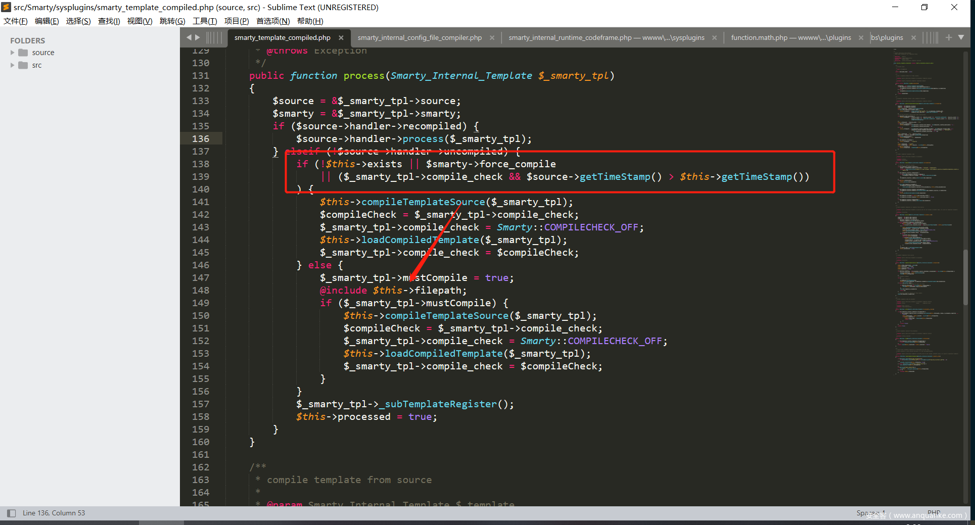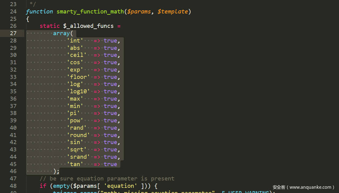 在 Smarty 中与 math 标签相关的部分位于 plugins 目录下的 function.math.php