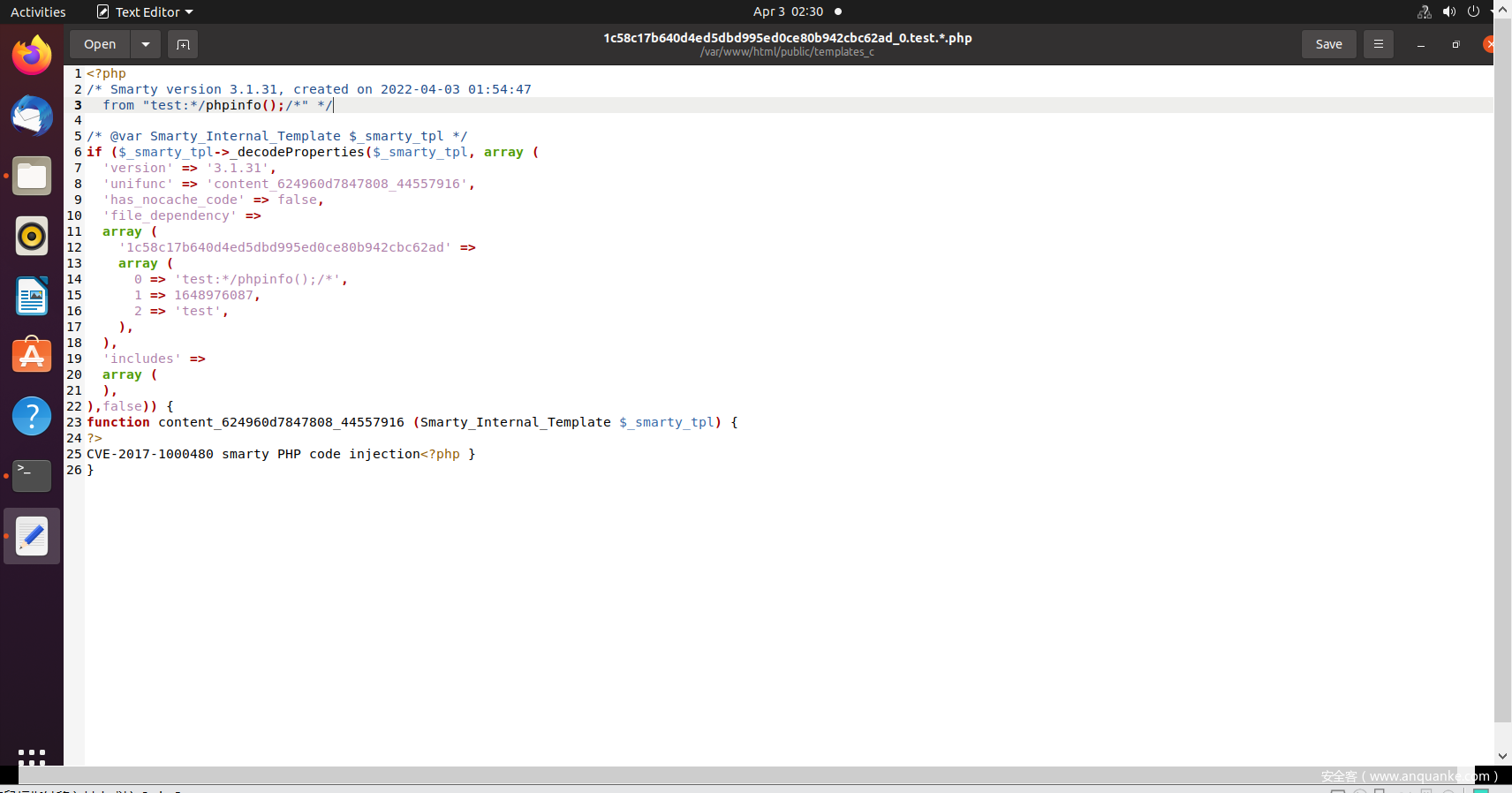 $template = "CVE-2017-1000480 smarty PHP code injection";