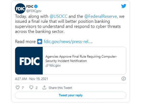 美国联邦银行监管机构批准一项新规。在该规则下,银行需在36小时内将重大计算机安全事件通知其主要联邦监管机构。也就是说,一旦银行发生重大网络攻击时,需及时向上级联邦监管机构报告,并详细说明受攻击后,运营、提供银行产品和服务的能力,以及对美国金融部门的潜在影响。